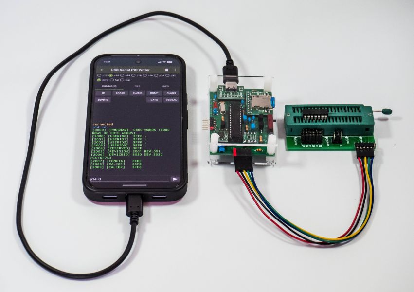 3)スマホとUSB接続(Android 3.1以上:USB Host API)して、スマホより操作して、プログラム(hexファイル)をPICマイコンに書き込みます。 Serial USB Terminalなどを使って操作できますが、自作の書き込みアプリも作成しました。